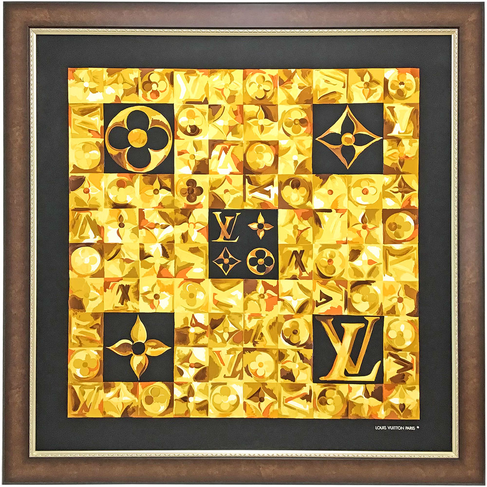 落ち着いた茶系のMDF7900ブラウンを選びました。モノグラム部分の明るさが引き立ちます。この額にはシルバーの装飾部分がありますが、艶消しの細かい植物柄のラインです。スカーフを十分に引き立てる物静かで上品な仕上がりになりました。