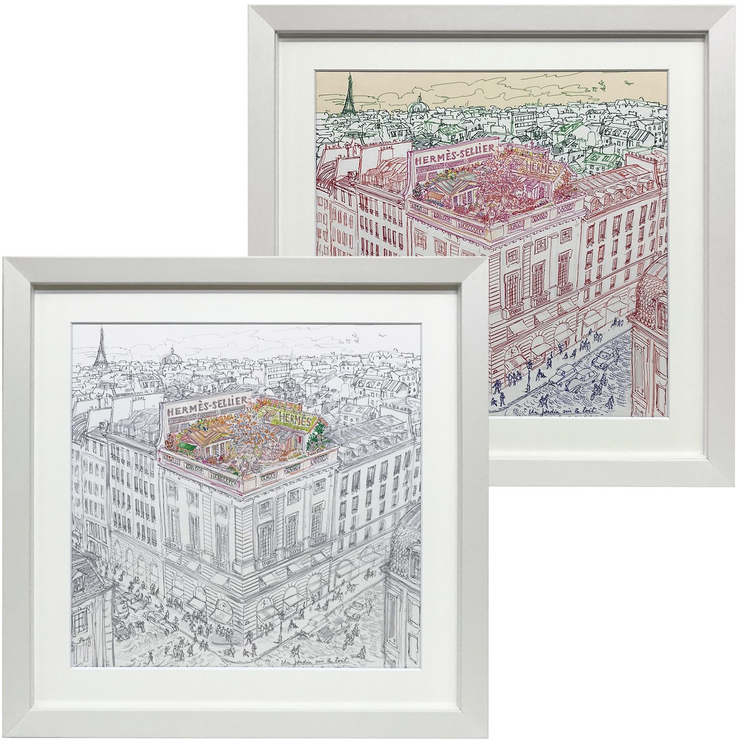 Jardin sur le Toit(屋根の上の庭)と名付けられた、45cm程度のハンカチサイズのスカーフ。プチカレとも呼ばれる可愛らしいミニサイズのエルメスのスカーフを、高さのあるホワイトのフレームで立体的に額装しました。
