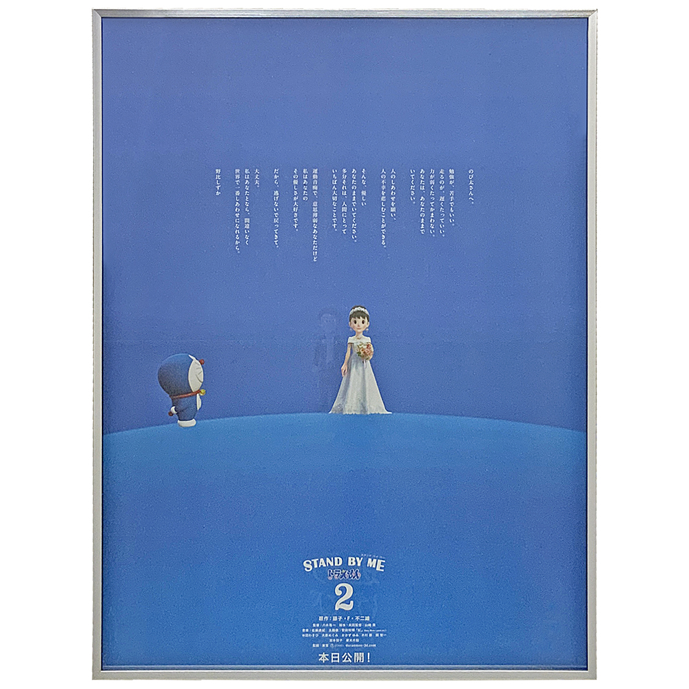 映画[STAND BY ME ドラえもん 2]の新聞広告の額装です。映画の公開日に合わせて、読売新聞から発行された新聞広告。花嫁姿のしずかちゃんとドラえもんが描かれ、肝心ののび太がいません。新郎であるのび太は、両面印刷の裏側に一人で描かれています。透かして見ると、手を取り合った新郎新婦となる心憎い演出です。
