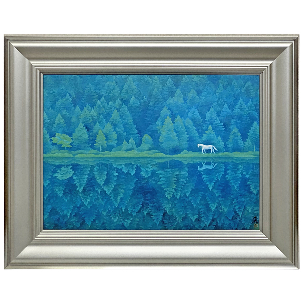 東山魁夷の代表作「緑響く」の額装です。キャンバス画布に再現された作品をお預かりし、画布を厚さ20ミリ程度の土台に張り込んだ上で、ステンレス製の額縁に飾りました。