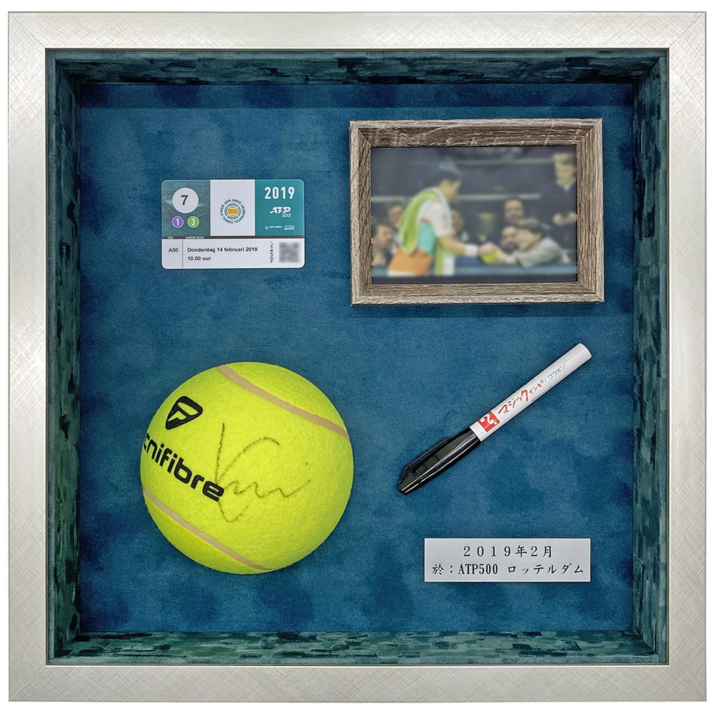 直径13cmほどの、サイン用の大きなテニスボールの額装です。「ATP500 ロッテルダム」大会の会場で、錦織圭選手からもらったサイン入り!サインをもらった時のマジック、お写真、大会パスなども一堂に飾り、何物にも代えがたい思い出の一品になりました。