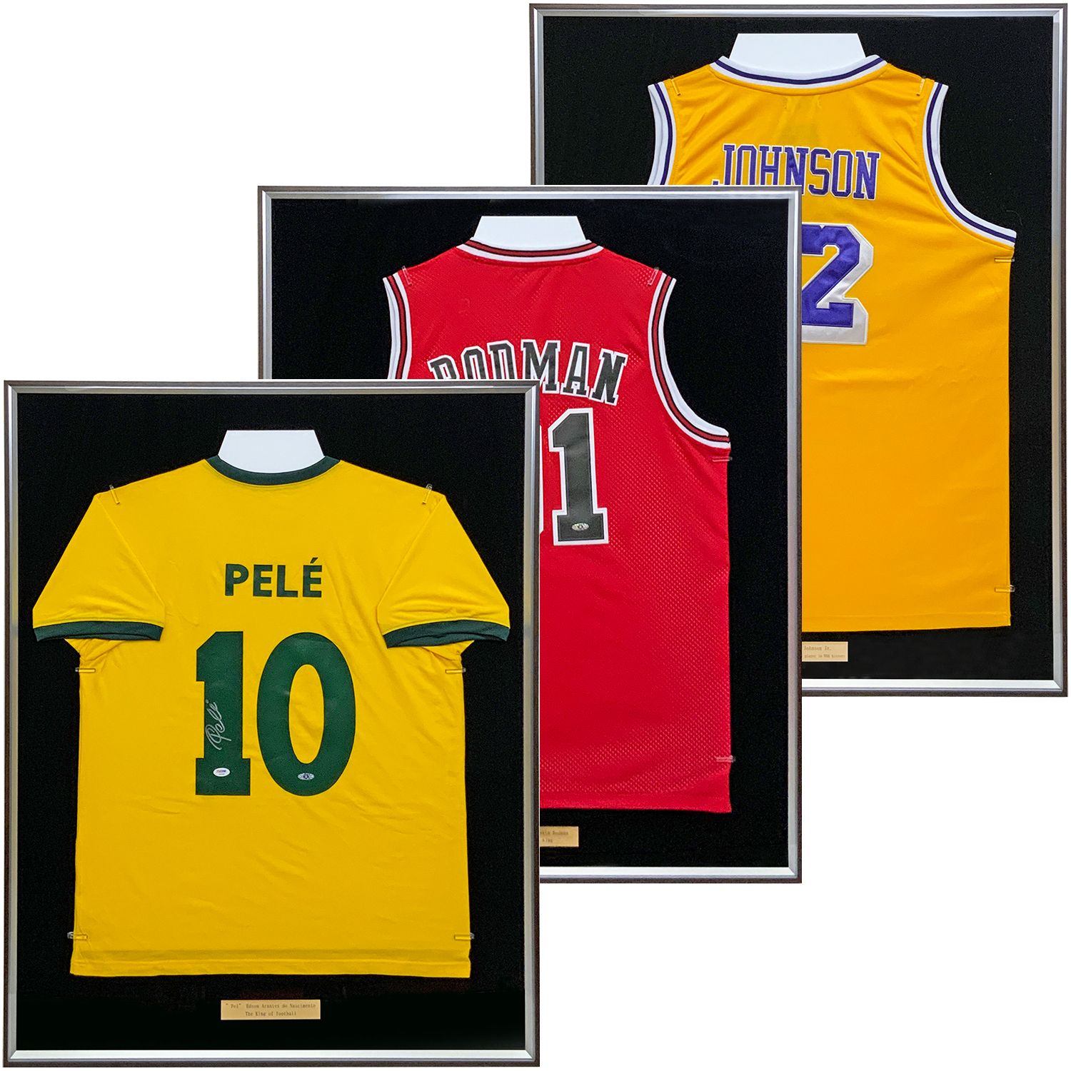 ペレ、マジック・ジョンソン、デニス・ロッドマン、レジェンドたちのサイン入りユニフォームの額装です。