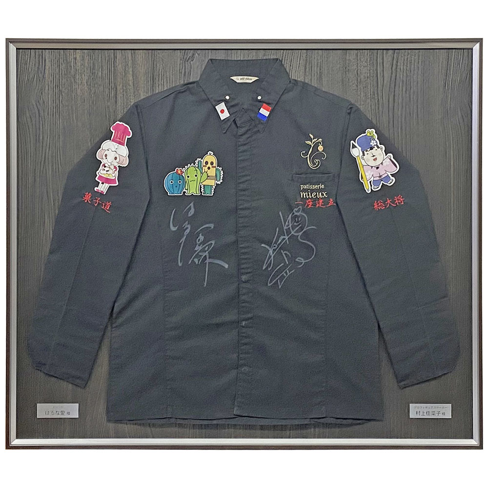 テレビ番組のロケに使われたものでしょうか。はるな愛さんと村上佳菜子さんのサインが入った、パティシエコートの額装です。スマートなアルミフレームを使って、重厚になりすぎないライトな仕上がりを目指しました。