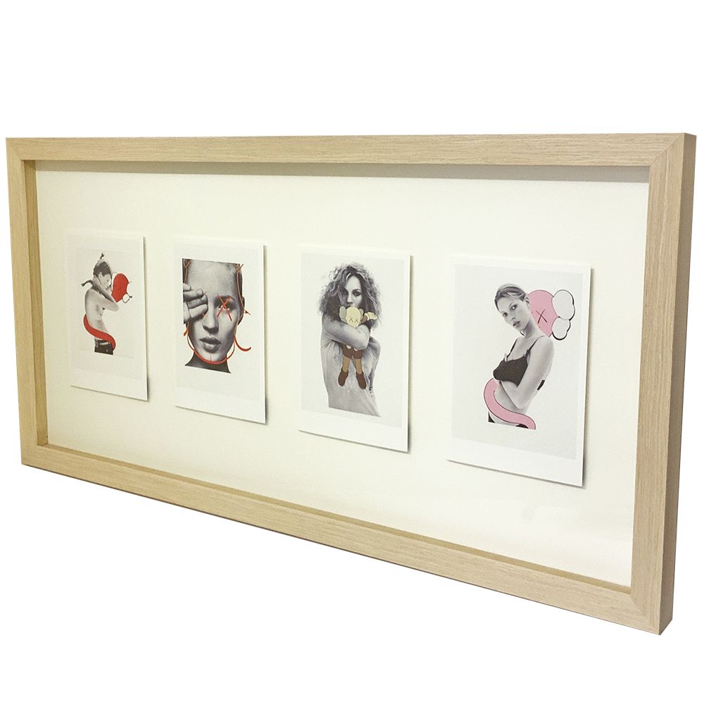 複数枚のポストカードは複数窓抜きしたマットを組み合わせて飾るのが一般的ですが、こちらの額装例では立体額を使った浮かし額装に仕上げました。
