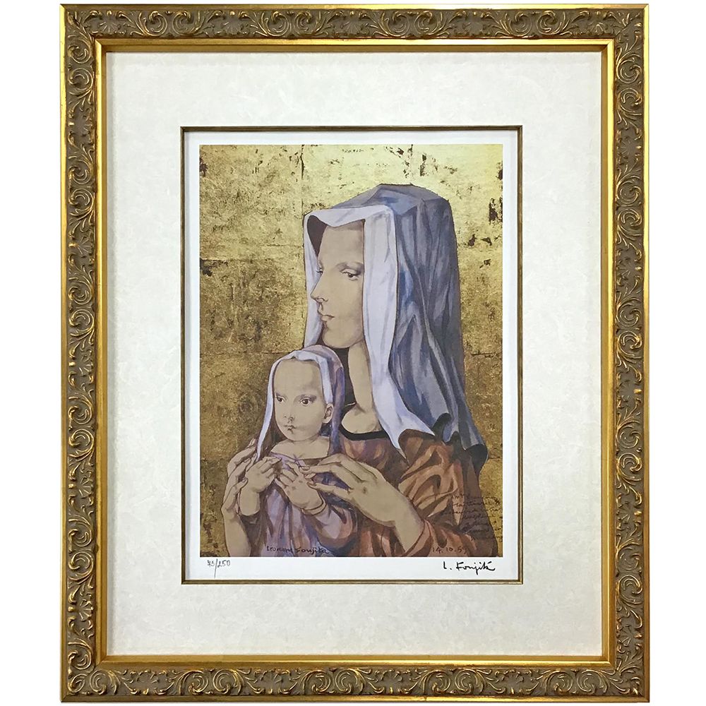 藤田嗣治の聖母子像(複製画)を額装しました。絵の上方からの光の反射が自然に再現されていて、本当に光っているようです。オリジナルの作品が持つ荘厳な雰囲気を引き立てるため、規格縁の中でも自然な汚し加工(長い時間を経たような質感を出す加工)の施された額で、色味が合うものを探しました。複製画をお預りし、作品の実際の色味を見ながら、スタッフが額を選ばせていただきました。