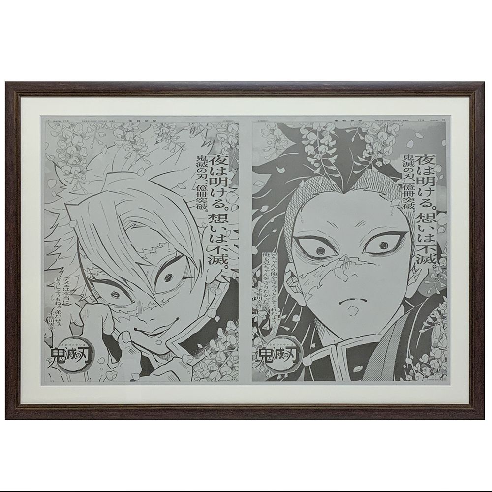 2020年12月4日、全国の新聞5紙に「鬼滅の刃」最終巻発売記念として掲載された新聞広告です。主要人物の総勢15人がそれぞれの新聞を飾り、ファンの間でも大きな話題になっていました。今回はその内の、不死川実弥と不死川玄弥の兄弟が揃った見開きページの裏打ち額装しました。