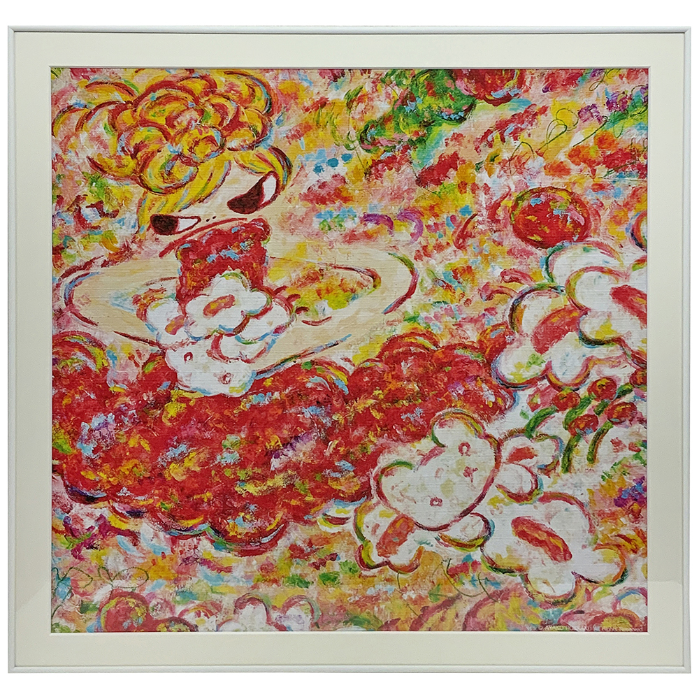 アクリル絵の具を直接手に取って描くロッカクアヤコさん。カラフルさと可愛らしさに溢れた、大きなバンダナの額装です。千葉県立美術館で2021年1月11日まで開催された、「魔法の手 ロッカクアヤコ作品展」で販売されていた品物のようです。
