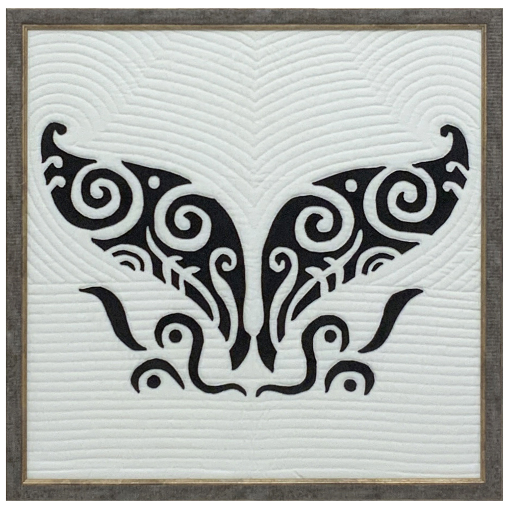 特にハワイで幸運の象徴として親しまれている、ホエールテール(くじらのしっぽ)をモチーフにしたキルト作品の額装です。モノトーンでシンプルに表現されたくじらのしっぽですが、白地部分に丁寧に施された縫い跡が、何やら幸運のパワーウェーブのようにも見えます。