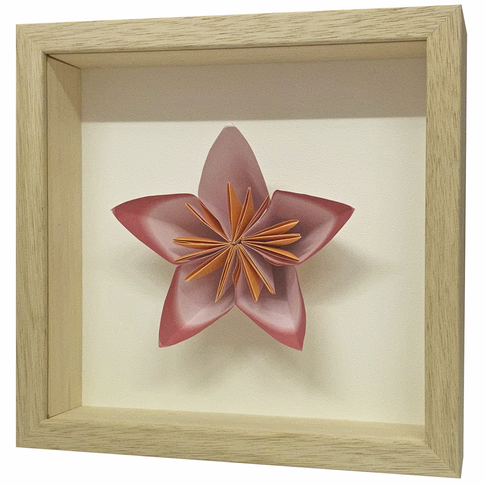 こちらの折り紙は、大まかに言うと円錐状です。裏面は尖っていて、固定の余地がありません。額装マットを中空に配置して、円錐状の折り紙を差し込めるようにしました。また、額縁内部の深さを折り紙の高さとイコールにして、軽く挟み込む形にしています。