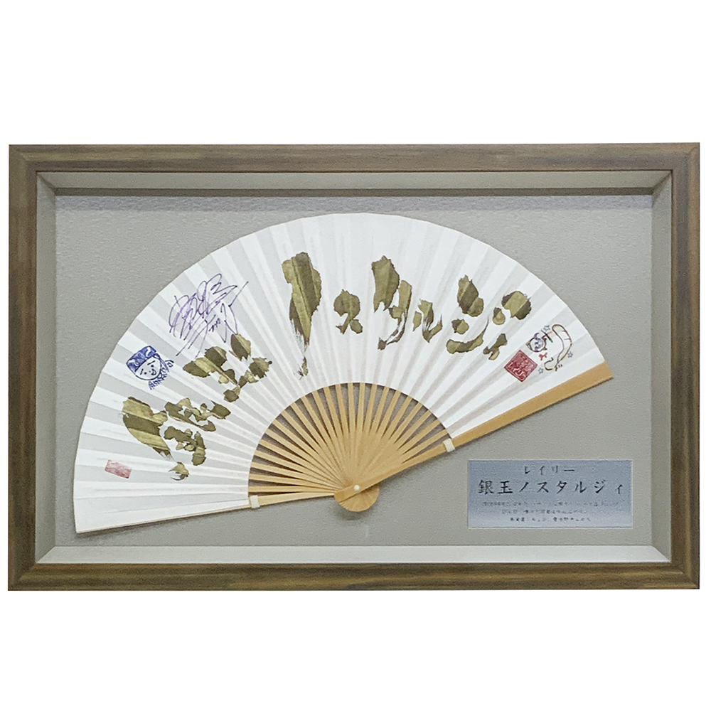 パチンコ必勝ガイドのライターとして活躍する、レイリーさんが描いた扇子の額装です。元書道塾教師という経歴が窺える、味のある見事な書が書かれています。