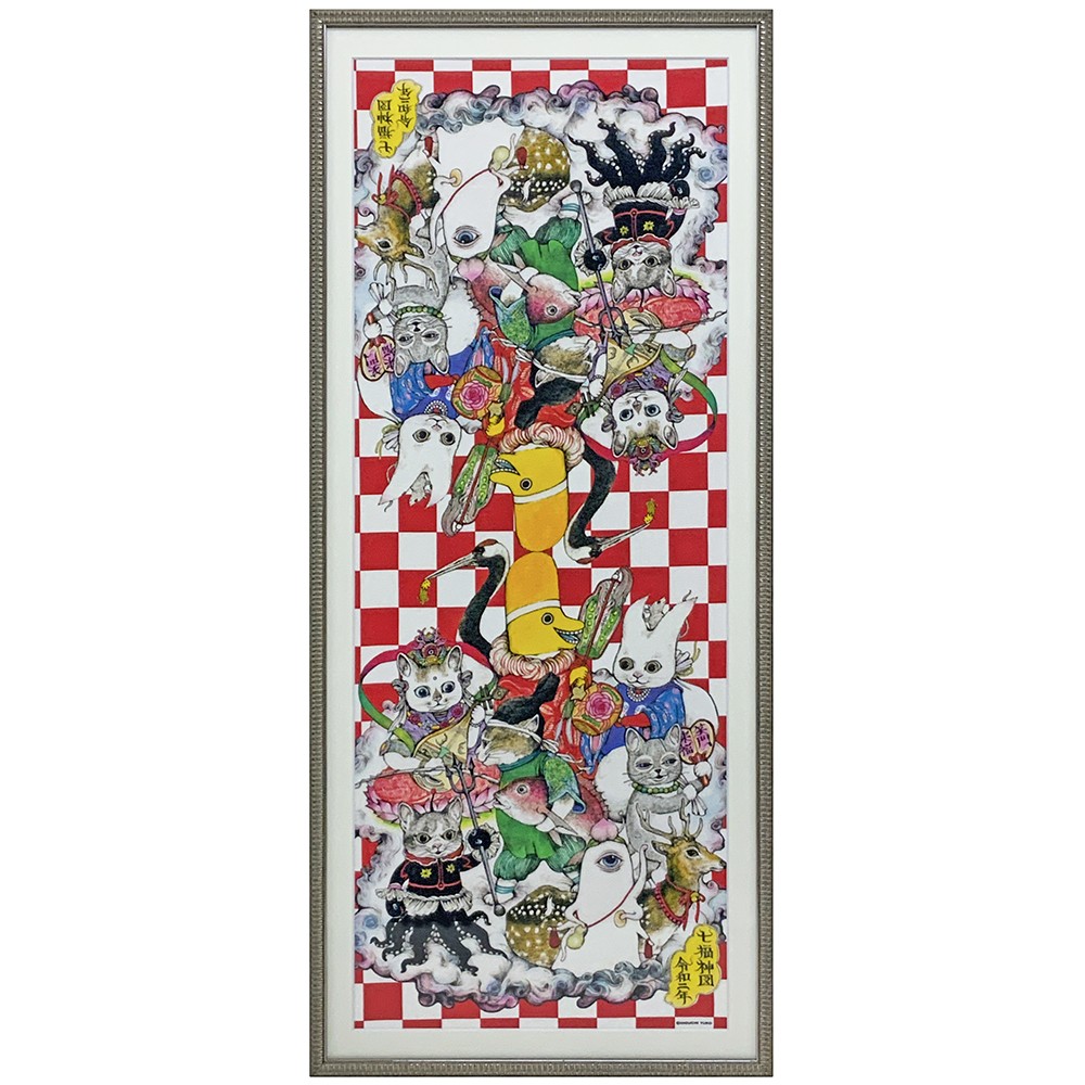 こちらはそんなヒグチユウコさんデザインの手ぬぐいです。350×900ミリと、ごく一般的な手ぬぐいですが、オーダー専用のこだわりのフレームに、マットを付けて額装しました。猫の七福神が描かれた縁起物。好きな作家さん、かつご利益が期待できる縁起物なら、お家に飾らないわけにはいきません。