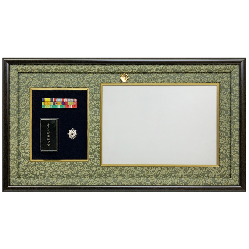 賞状部分の左側に、防衛功労章と防衛記念章、ケースが入る小窓を設けました。額縁の中央には、弊社で用意した菊紋を付けています。お好みになりますが、菊紋は防衛功労章(バッジ)の縦並びで飾っても良いでしょう。