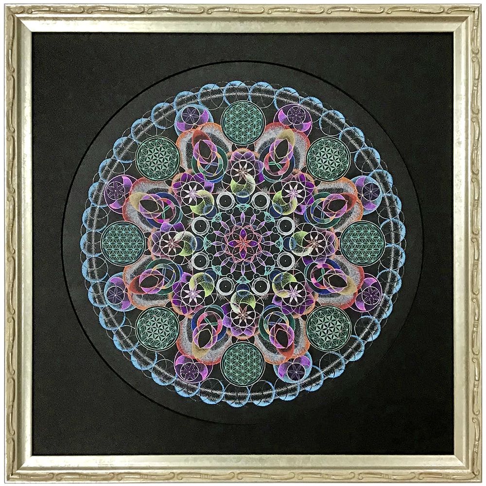 グラデーションがとても美しく、サイズが大きいので近づいてみないと点で描かれている事が分からないほど。パール色のペンで描くと、インク自体が光を反射しますので、黒い紙から浮き出るようなコントラストがでます。ひとつひとつの意匠も眺め飽きないのに、それが集まって織りなす全体像はまさに曼荼羅です。