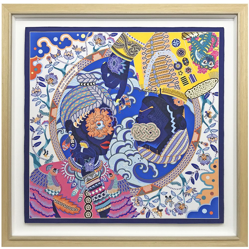 現代装飾家の京森康平氏によるスカーフ「デュオ・コスミック」。エルメス・カレのデザインコンクールにおいて、グランプリを受賞した逸品です。一般的なスカーフ額装とは異なる、浮かし額装で仕上げました。