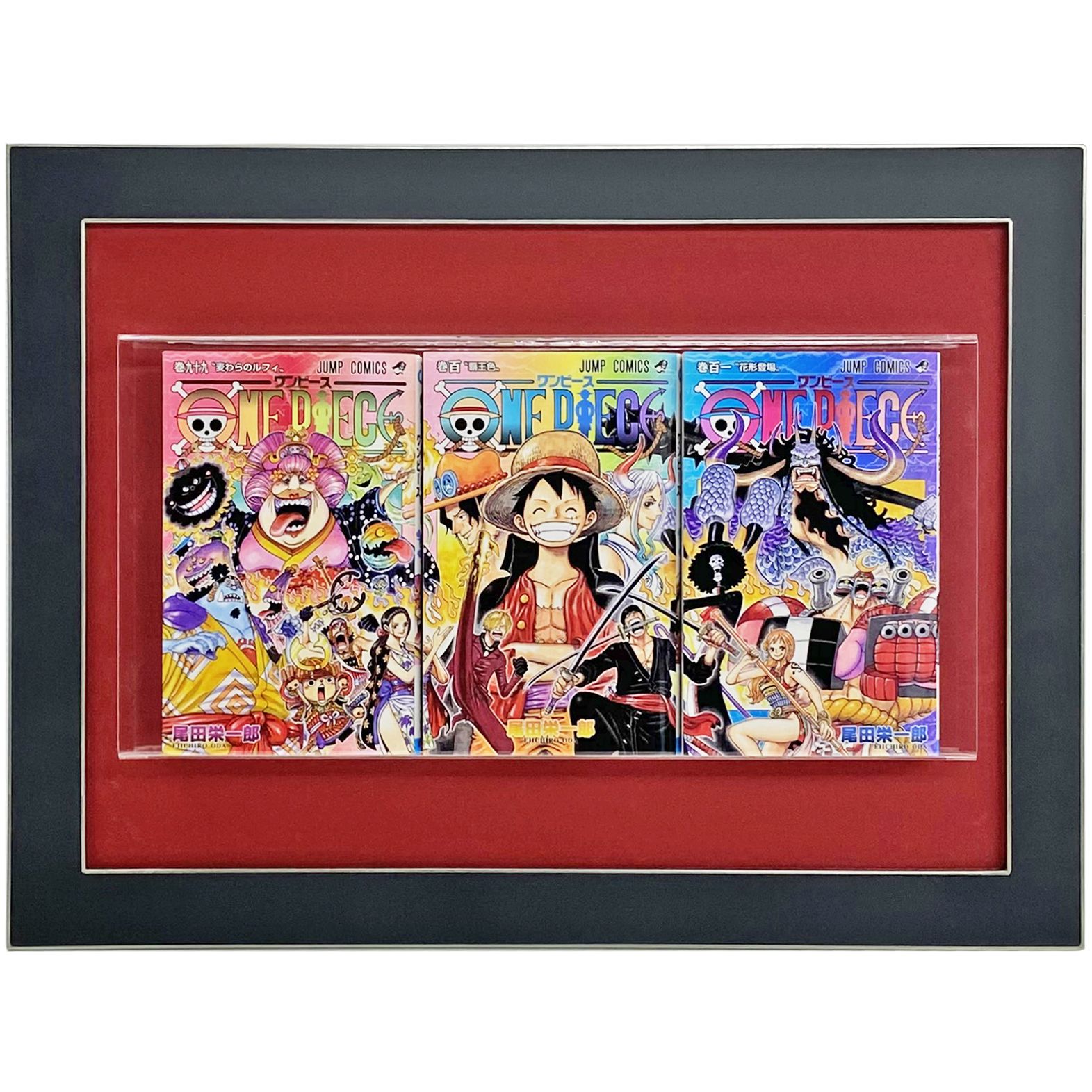 累計5億部目前!ワンピースの99巻・100巻・101巻のコミックスを並べて額装しました!99巻に収録の第1000話や100巻を記念してか、この3巻は「つながるカバー」仕様になっています。コミックスの表紙は、単品でも息を呑んでしまう素晴らしい物がたくさんありますが、3冊並ぶとなると飾らずにはいられません。