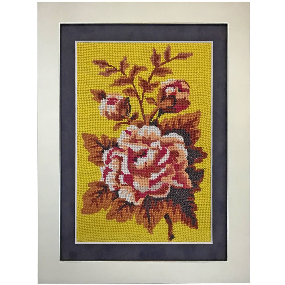 色鮮やかな刺繍をお持ちいただきました。海外の刺繍セットをお客様ご自身で仕上げたとのことです。クロスステッチのようにも見えますが、クロスしているというより斜め向きに刺してあるようです。一方向に糸が整っているのでツヤが綺麗なのが印象的でした。作品の現代的な色使いを生かした額装を目指しました。
