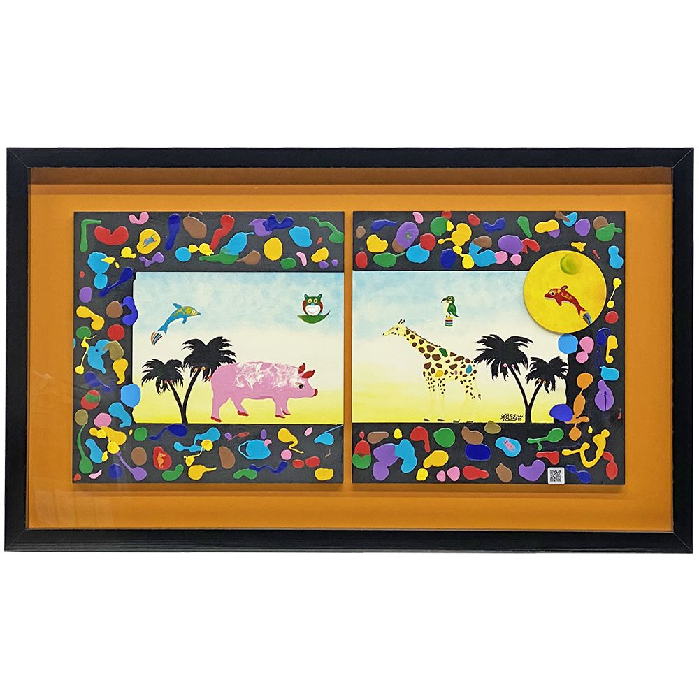 2枚が繋がる構図で描かれた、アクリル画の額装です。350センチ程度の正方形のパネル、横長の立体額の中に並べて飾りました。背景マットの裏側から、作品の木枠部分をネジ止めして固定しています。作品はあえてくっつけず、10ミリほど離してレイアウトしました。