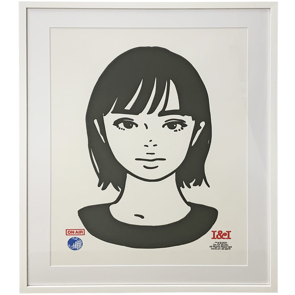 福岡を中心に活躍するアーティスト、KYNE(キネ)のTシャツの額装です。氏のトレードマークともいえる、クールで物憂げな表情の女の子がどーんとデザインされたTシャツですが、Tシャツっぽさを出さないように額縁に飾っています。