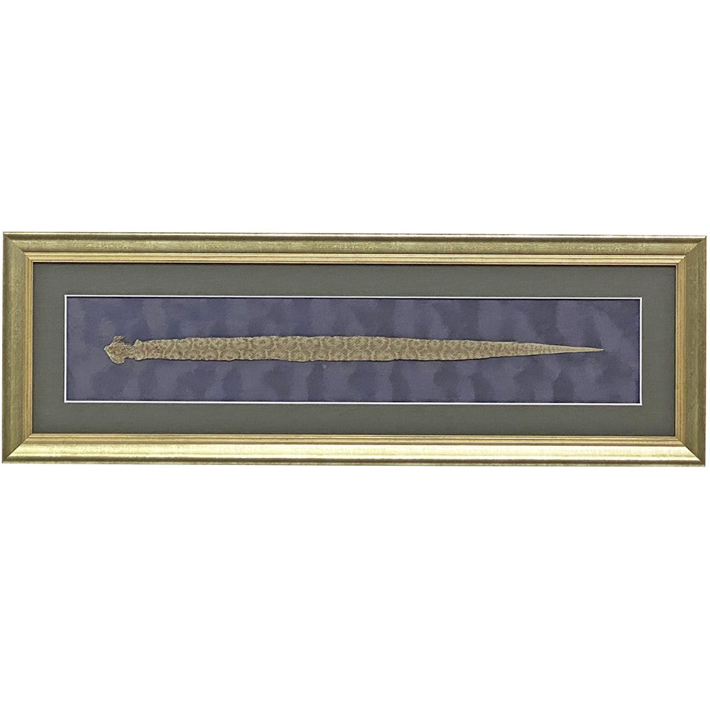 蛇は1-2か月に1回脱皮を行うようです。ペットスネークの場合は、きれいな状態で抜け殻をキープできることも多いと思います。こちらの額装例では、弊社での抜け殻の洗浄・額縁への固定まで行いましたが、抜け殻の扱いになれた方なら、ご自分で額縁にセットする楽しみがあります。ひとまず、抜け殻の形を整えてみて、額縁の大きさを検討してみてください。