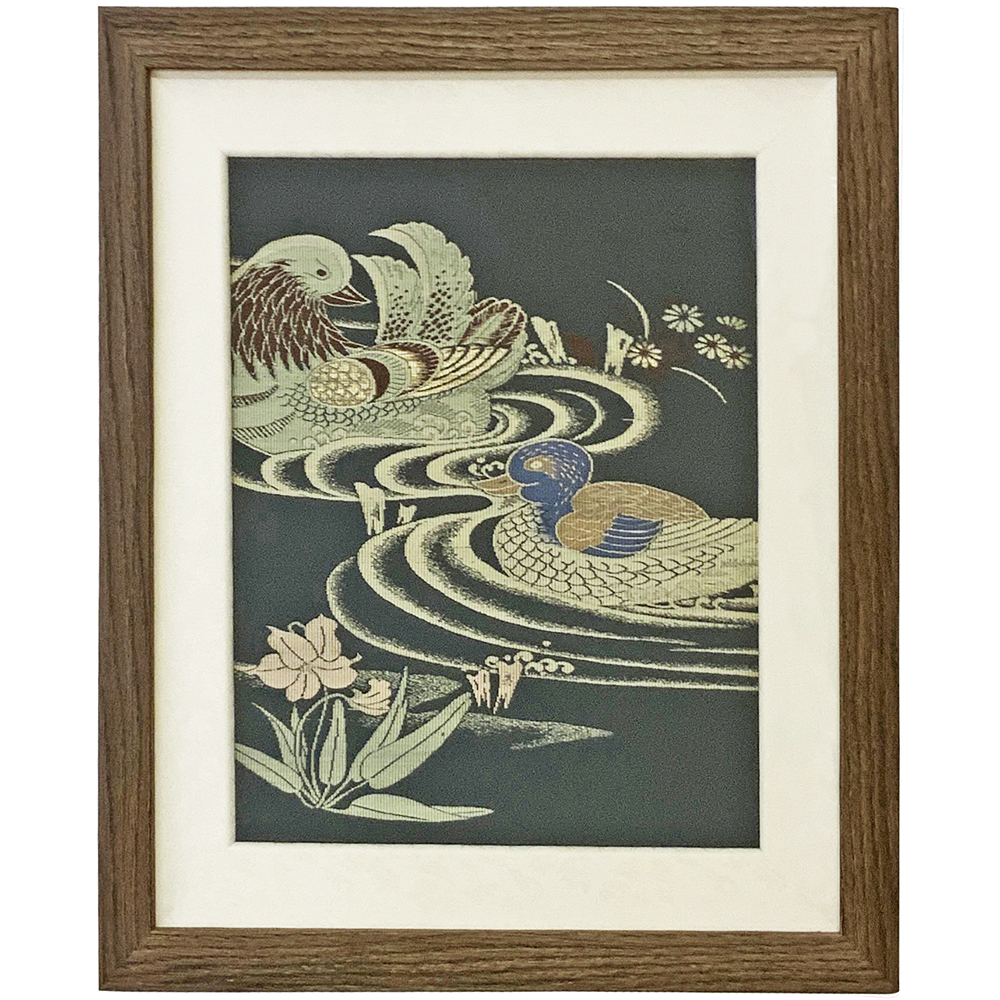 明治生まれのおばあさまから、形見として受け継いだ袋名古屋帯の額装です。「袋名古屋帯」とは、芯なしでかがるだけの手軽な帯のこと。昭和初期に考案され、軽さと締めやすさで普及が進んだそうです。こちらの帯も非常に使い込まれていたようで、着用し続けるのは難しかったようですが、おばあさまを思い出す良い額装品に生まれ変わりました。
