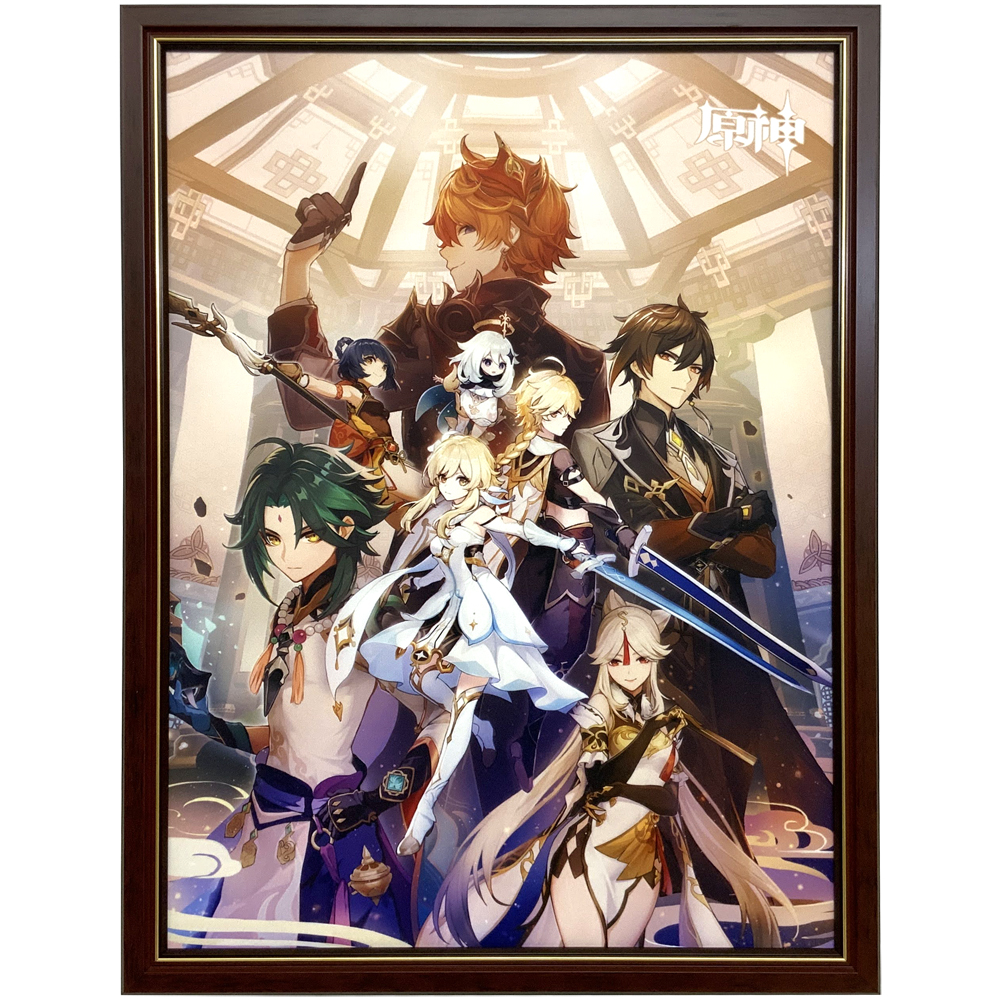 人気オンラインゲーム「原神」のキャラクターが描かれたタペストリーを特注サイズの額で額装いたしました。額縁規格サイズ外の寸法だったため、タペストリーに合わせた寸法で製作しています。