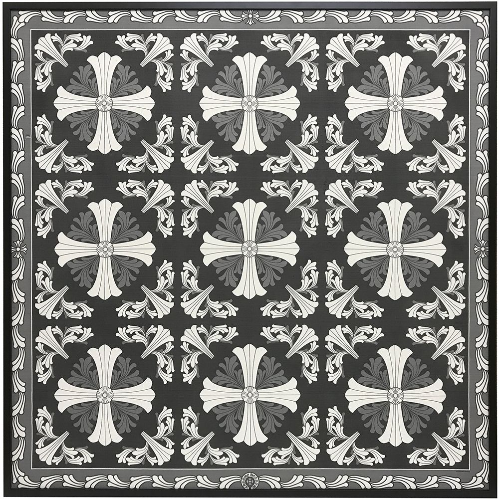 1m四方程度の大きなクロムハーツのスカーフです。このスカーフは向こうが透けて見えるほど薄い生地になっているため、通常のスカーフよりも張り込みなどに注意が必要になります。また、張り込み後はこのスカーフの持ち味である繊細な透け感が失われることは避けられませんが、このデザインをインテリアとして飾ることができるのは額装の醍醐味のひとつでしょう。