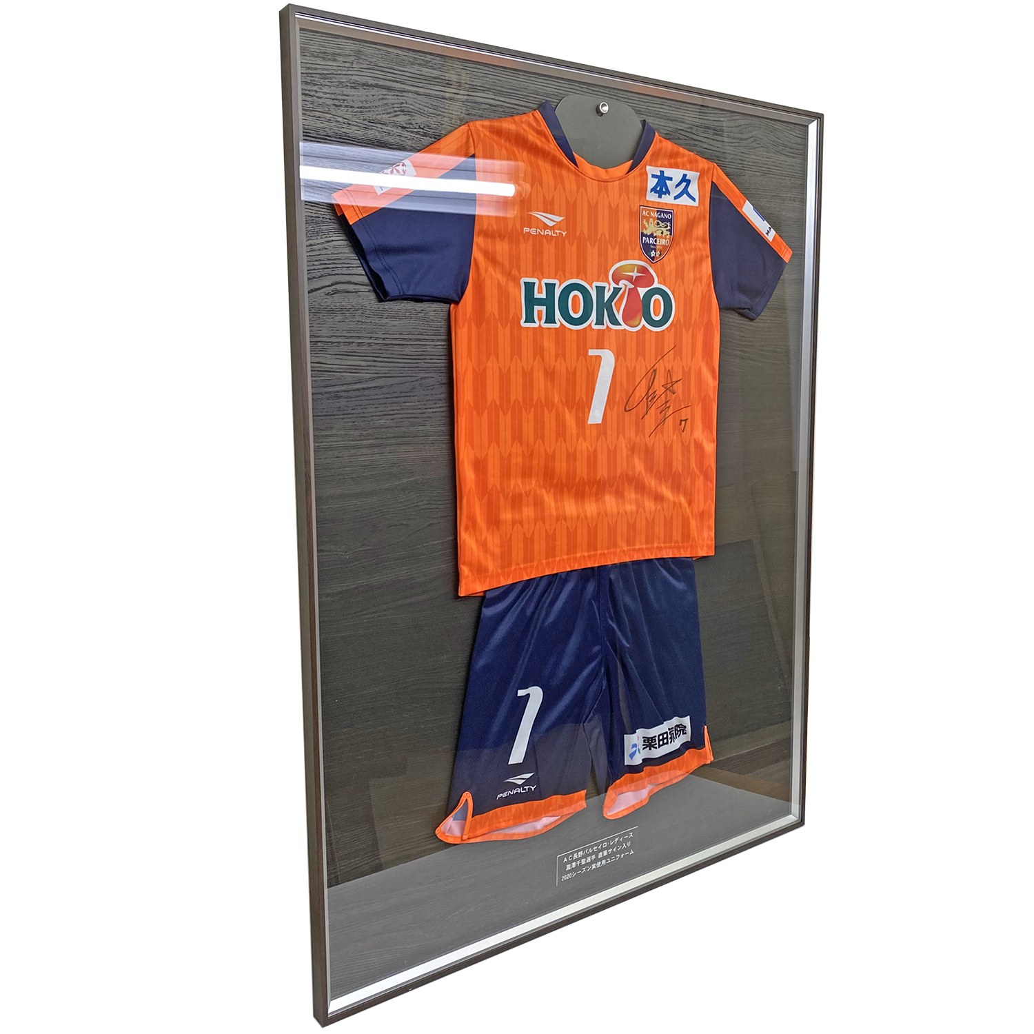 上半身用のハンガーに吊り下げた、パンツ用のハンガーも使って、ユニフォームの上下を違和感なく飾っています。ユニフォームの額装は、基本的に取り外すことを考えないピシッと伸ばしたセット方法と、ハンガーを使って自然に飾る方法に大別されます。いずれも一長一短がありますが、ハンガーを使った方法はお客様の手でもセットしやすいのがメリットです。