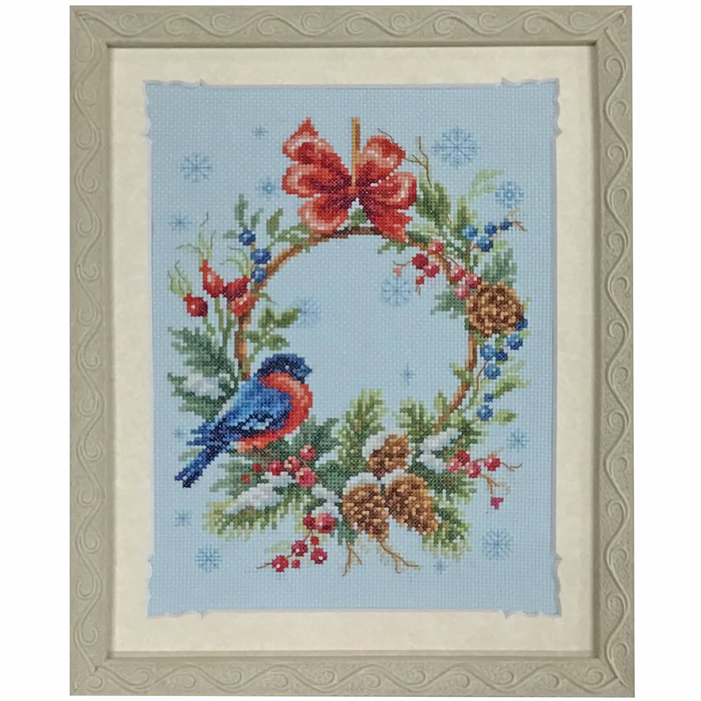 リースの刺しゅうの額装です。クリスマスリースにこんな小鳥が来たら…と想像が膨らみますね。