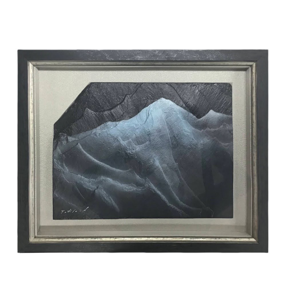 雄勝石が産出される地層は宮城県石巻市雄勝町にあり、成り立ちは古生代の後期まで遡ります。削られた滑らかな石板に淡い水色が着色してあり、漆黒の背景から山の絵が美しく浮き出ています。普段は決して穏やかではない山の頂が、夜空をバックに静かに眠っているようです。穏やかな自然の中では、山々の変化はその大きな姿と比べればほんの少しずつです。私たち人間一人一人が見届けることがない時間の流れに触れるような、不思議なアートです。