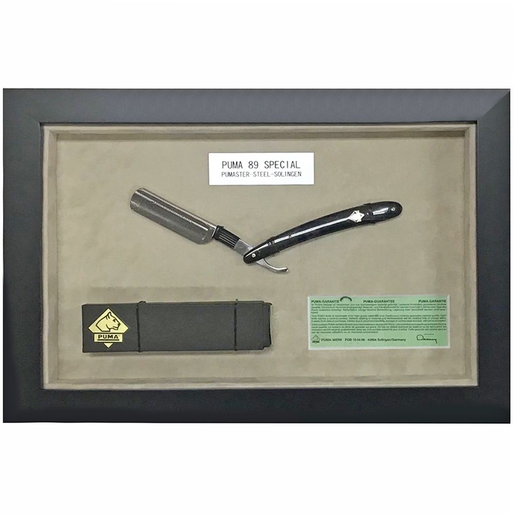 美容師のお客様からご依頼いただき、ドイツ・ゾーリンゲン製の剃刀「PUMA 89 SPECIAL」を額装しました。伝統ある刃物の街からやってきたカミソリ、きわめて繊細な仕事を任される道具です。お客様のメンテナンスがこれまた素晴らしく、お手入れが行き届いたものを、手ずから店頭にお持ちいただきました。