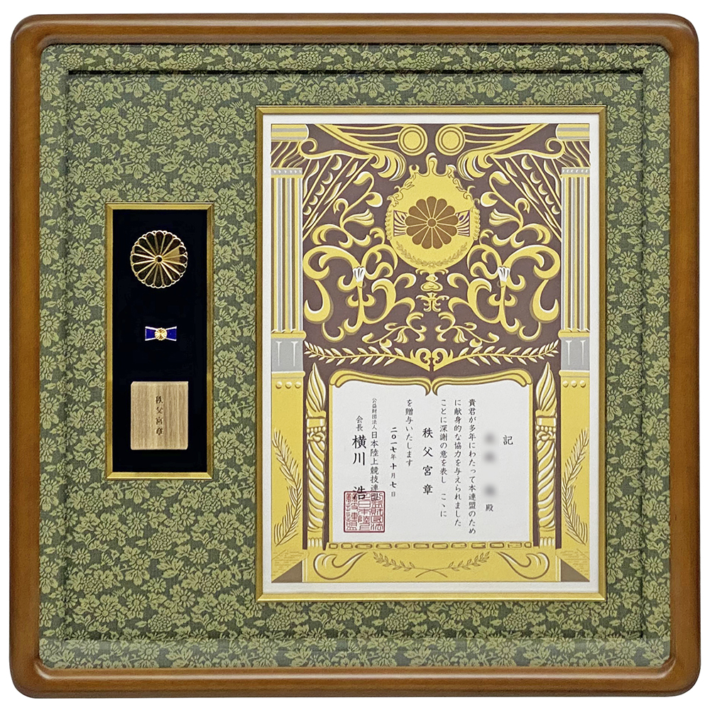 秩父宮章は公益財団法人日本陸上競技連盟より授与される、陸上競技の発展・普及・人材育成などに尽力した団体や個人に授与される名誉ある章です。A3サイズの賞状とセットで贈与されますが、賞状の全面にわたって描かれたデザインが特徴的。メインとなるはずの文面をのぞき込むような、斬新な賞状が目を引きます。