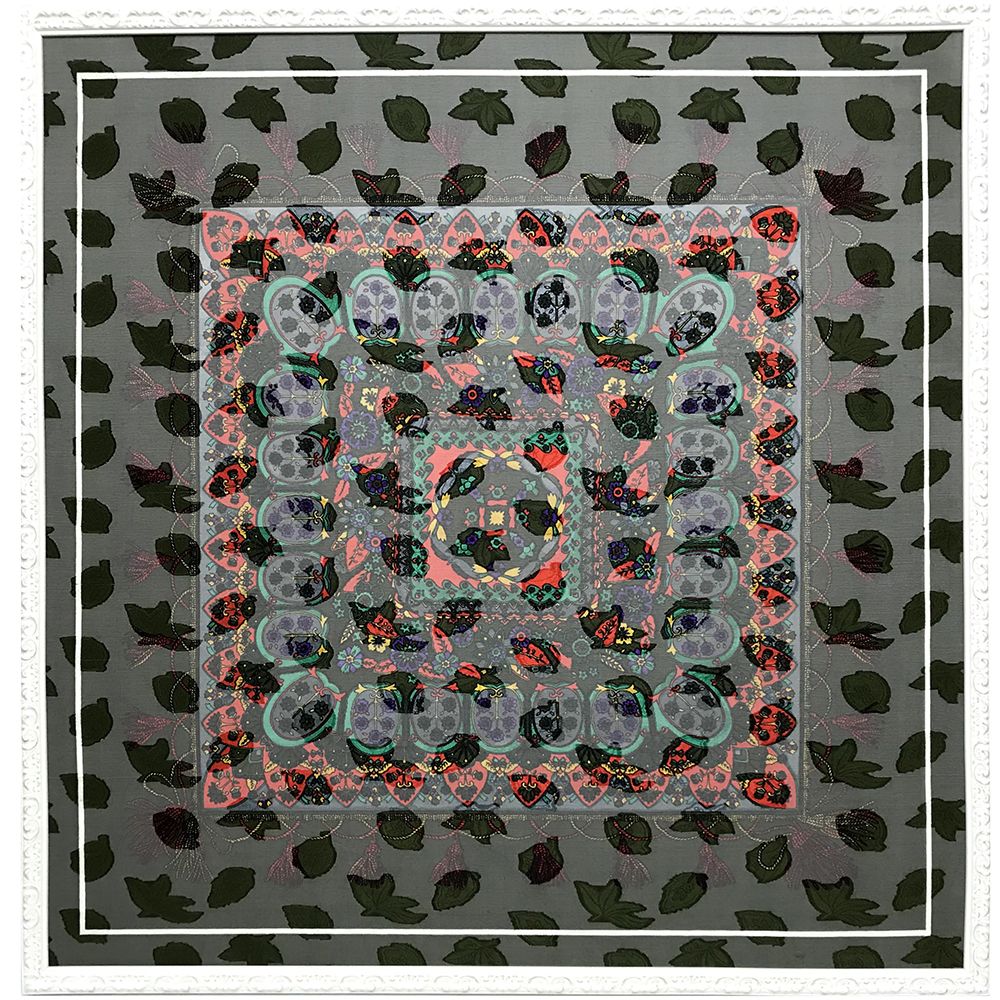 透かしの布地が折り重なったような、特徴的なスカーフです。当店のスカーフ額装は、基本的にスカーフの全体を貼り付けて固定しますので、どうしても透け感は軽減されます。透け感が無くなる分、絵柄がくっきりと際立つメリットはありますが、見た目の雰囲気は大きく変わることでしょう。