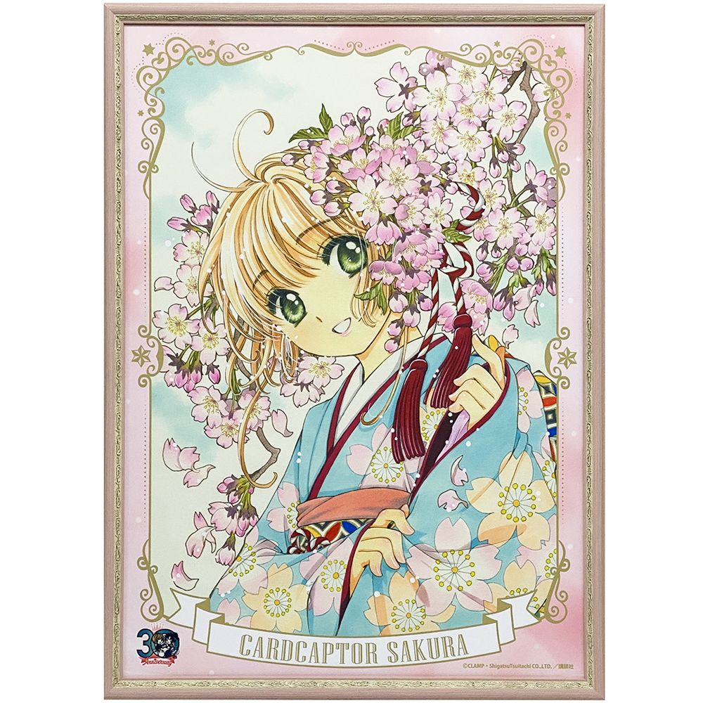 講談社の漫画雑誌「なかよし」で、1996年6月号から2000年8月号まで連載された「カードキャプターさくら」。こちらは原画イラストを元にした、「カードキャプターさくら」のタペストリーの額装です。