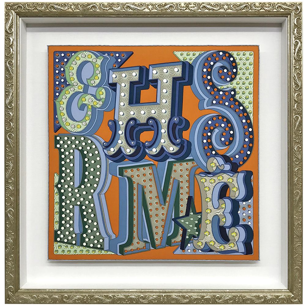 エルメスエレクトリック(Hermes Electrique)、45cm程度のプチカレの浮かし額装です。浮かし額装とは、品物よりも一回り大きなボックス額の中央に、土台を噛ませて浮かび上がらせて飾ること。構造上、スカーフの端っこまで全て見えるのがポイントです。こちらの額装例では、電飾に彩られたエルメスのロゴが、クラシックデザインのシルバーフレームの中央に浮かびました。