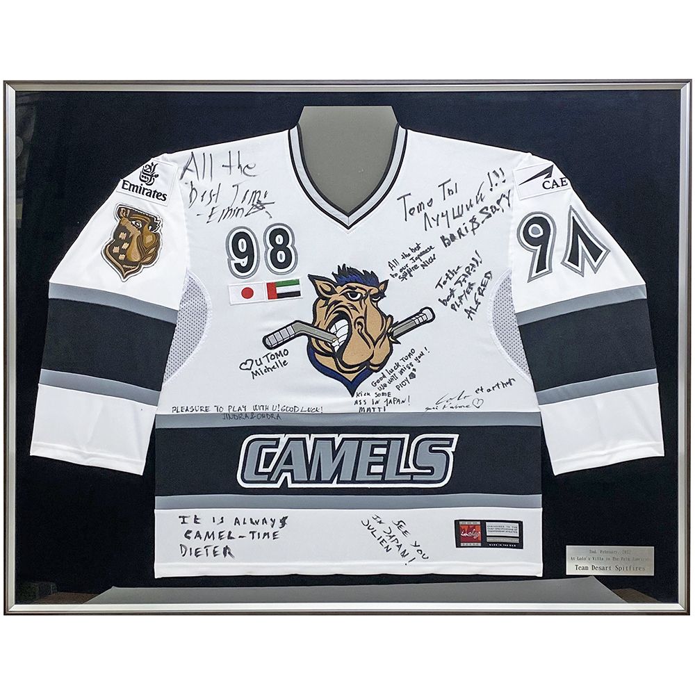 アラブ首長国連邦のアイスホッケーチーム、ドバイマイティキャメル(Dubai Mighty Camels)のサイン入りジャージの額装です。アイスホッケーのジャージではありますが、そこまで分厚い生地ではありません。型紙を入れ込んで形を整えつつ、縫い付けと両面テープを併用して額縁にセットしました。