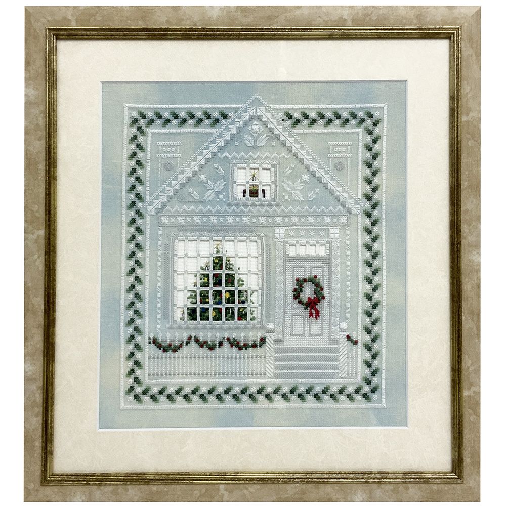 2枚のベース布に作られた刺繍を、重ね合わせて額装しました。表面の地が水色の作品は、格子状の刺繍糸が渡っているだけで、窓の3か所が透けています。透けた窓の外には、裏に重なった刺繍のツリーやろうそくが見えるという構造です。