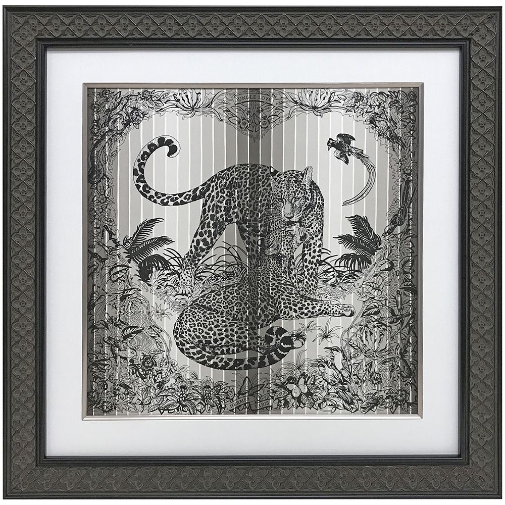 エルメスカレ、「JUNGLE LOVE」の額装です。様々なカラーバリエーションのあるJUNGLE LOVEですが、こちらは白と黒のみで表現されています。フレームを黒、マットを白、マットの面先を飾る面金を銀色にして、色味の無いモダンな額装に仕上がりました。