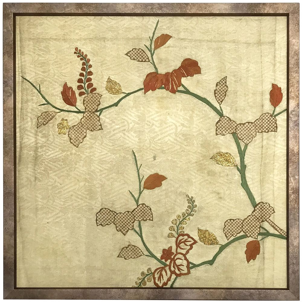 こちらの小袖裂は、18世紀!頃の品物だそうです。様々な人たちによって時代を超えてきた品物には、得も言われぬオーラがあります。保存額装にも配慮した専用のボードに貼り込み、皺やたるみをピシッと伸ばしてから額装しました。まだらなカラーリングが施されたアルミ素材のフレームを合わせて、モダンな仕上がりになっています。