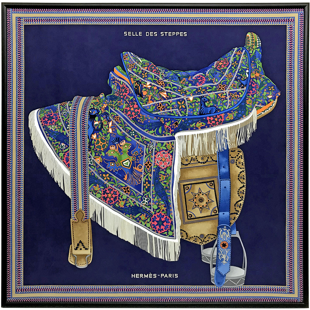 エミール・エルメス・コレクションが所蔵する19世紀末のトルクメニスタンの鞍を描いた、[エルメスカレ90 セル・デ・ステップ]の額装です。