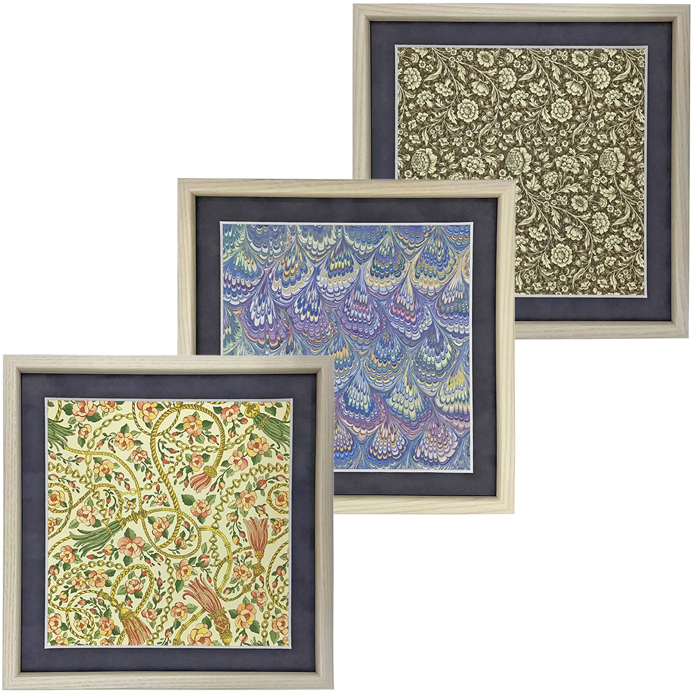 ※参考価格は1点分の金額になります。柄と色合いの異なる化粧紙を3枚、おそろいの額に入れました。パネル仕立てなどにもできますが、退色が心配な場合はアクリルガラスの入ったシンプルな額に入れるのもおすすめです。マットを入れずに額装する場合は、アクリルガラスと同じ寸法に包装紙や折り紙などを裁ち落とせば、簡単に入れ替えも可能です。