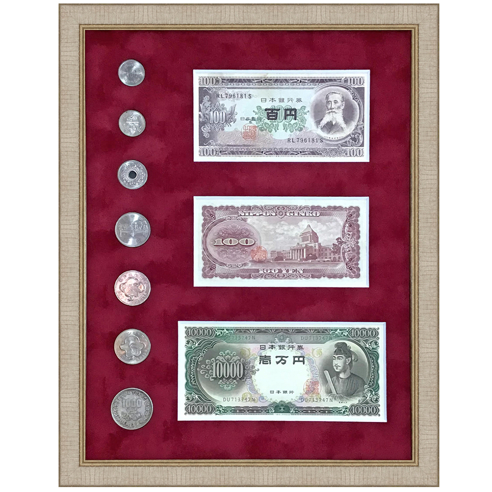 紙幣3枚と磨かれた硬貨7枚の額装です。硬貨は1964年のオリンピック記念、青函トンネル開通記念、瀬戸大橋開通記念と、時代とともに国内外へ開かれて行った日本を感じさせます。