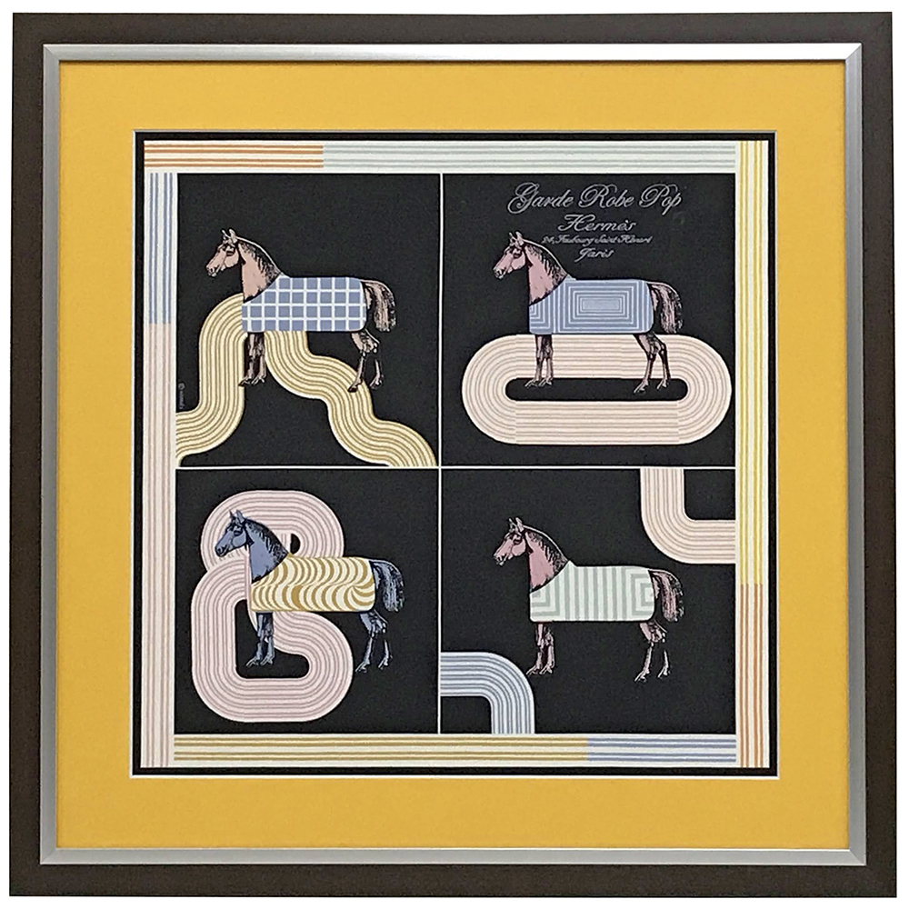 エルメスのカレ45「ガルド・ローブ・ポップ・デタイユ」をマット付きで額装しました。カラーバリエーションの豊富なデザインで、4種類の馬着を纏った4頭の馬のデザインが素敵ですね。