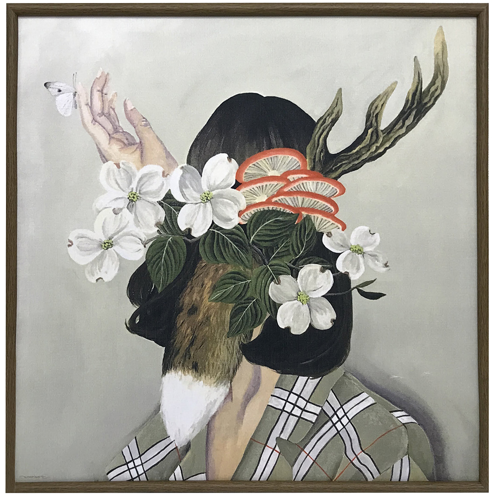 顔を覆われた?物画が特徴的な榎本マリコさん。こちらは榎本マリコさんが2017年に発表した[beginning]のスカーフ?ハンカチ?です。ほぼ50cmの正方形ですが、元の作品も540×660ミリのようなので、おおよそ原寸大といっても良さそうです。