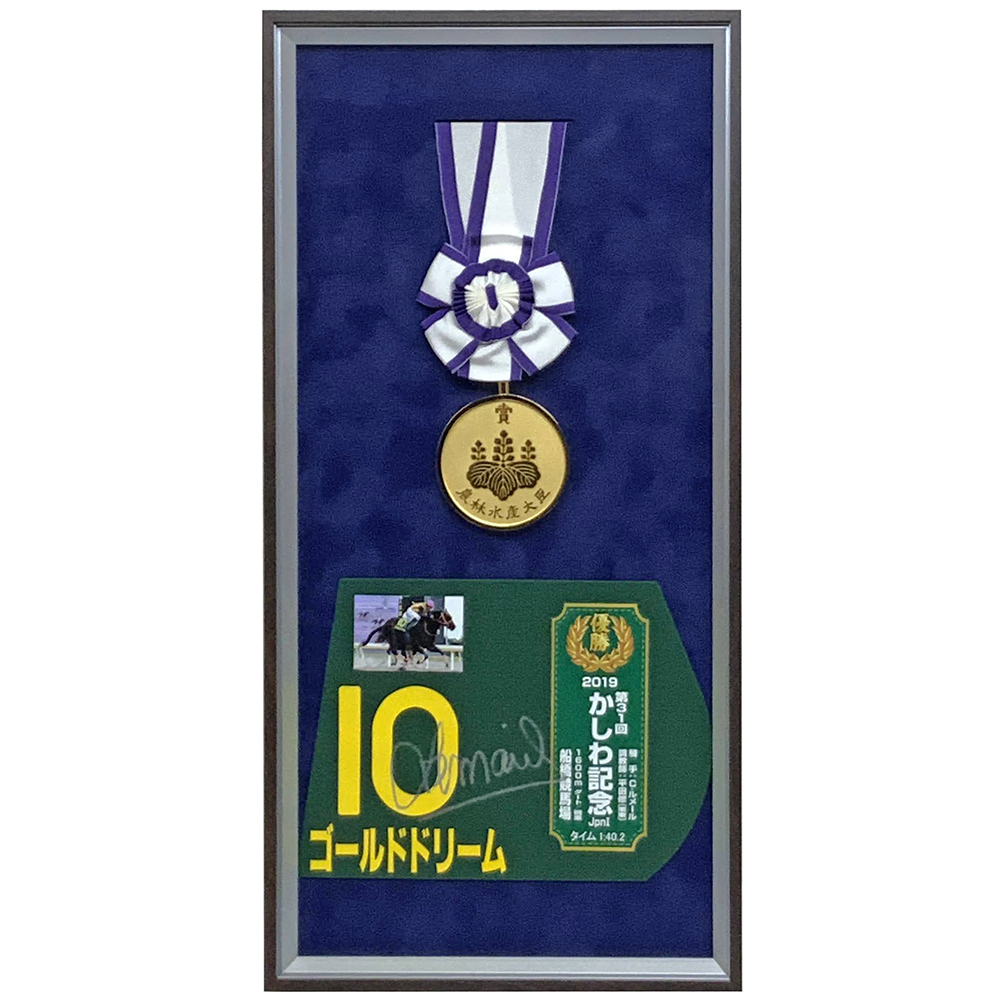 船橋ケイバで入場者数、売上金、賞金とも最高を記録する最大のレース、「農林水産大臣賞典 かしわ記念」の優勝記念品の額装です。横幅25cm程度の可愛らしいゼッケンと、立派なリボンが付いたメダルをセットで飾っています。非常にボリュームのあるリボンのため、立体額でリボンのふんわり感を損なわないようにセットしました。