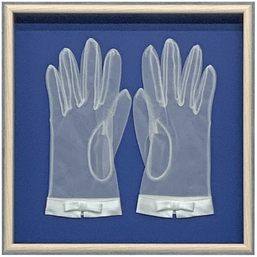こちらの額装例では、300×300(30角)サイズの規格サイズの立体額に、背景用の額装マットを合わせました。既製品を使った非常にシンプルな額装ですが、グローブの固定方法がポイントです。透けた生地が重なった見えない部分で、ピンポイントで針を通して縫い付けています。配送時にずれてしまうことを考えると、一本一本の指先に至るまで、乱れようがないように縫い付けを行いました。