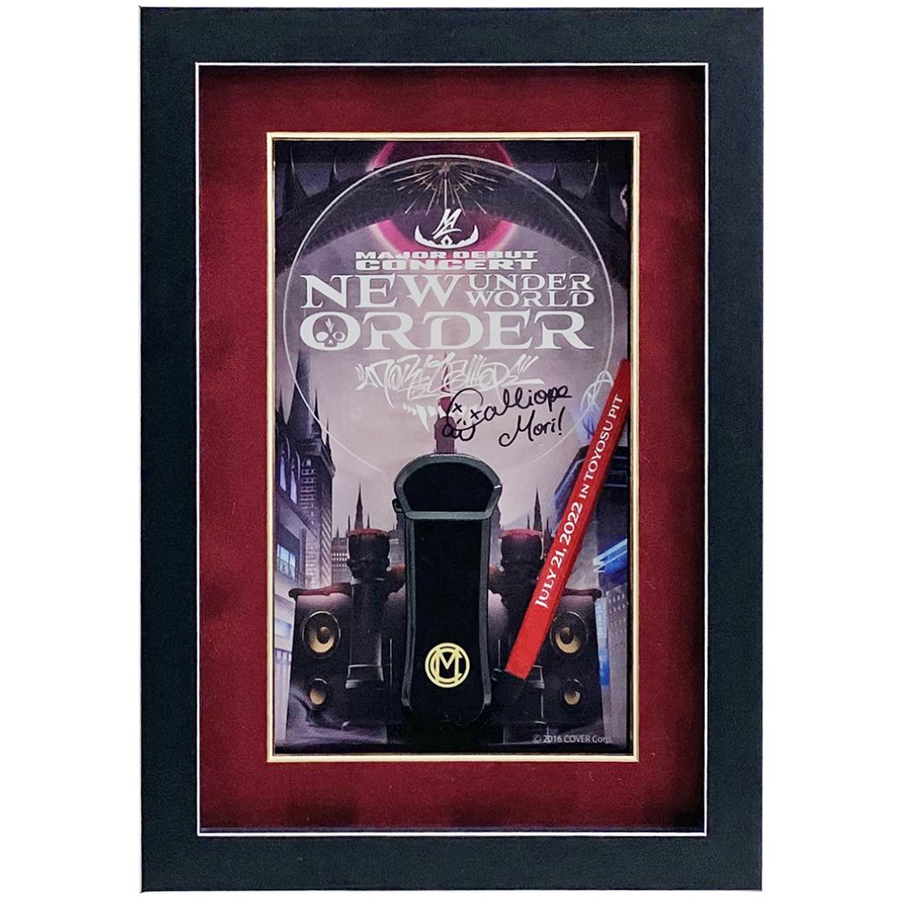 森カリオペはホロライブプロダクションに所属するバーチャルYouTuber(VTuber)。こちらは2022年の7月21日に開催された初のソロライブ、Mori Calliope Major Debut Concert 「New Underworld Order」のツアーグッズです。点灯するとピンクに光るアクリルライト。額縁の背景にライブパンフレットを配置して、サイン入りのアクリルライトが際立つ額装になりました。