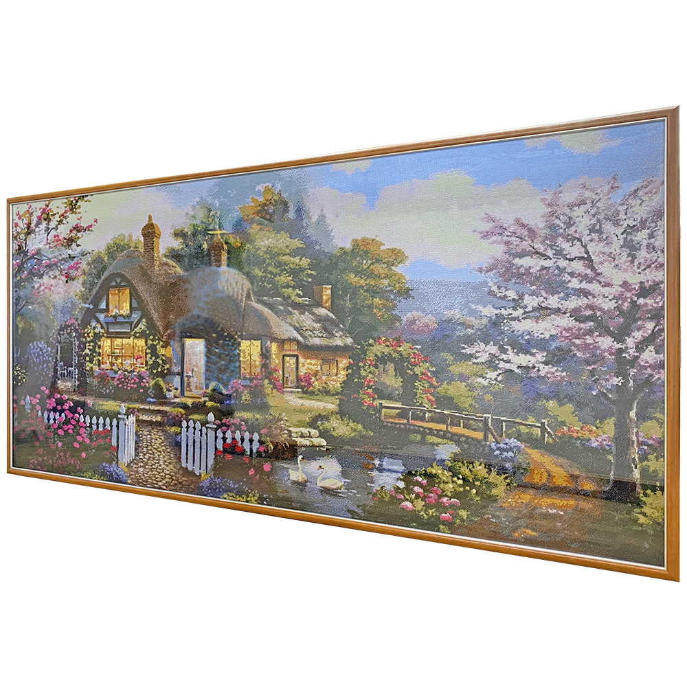 裏板パネルに作品を張り込み、作品周りに直接フレームが付く額装としました。庭園が描かれたクロスステッチに、柔らかな木調の色合いのフレームがよく合っています。手間暇を惜しまずに作られた刺繍作品は、お部屋に飾ってこそ完成です。額縁だけを用意することも、作品のセットまで行うことも、どちらも承りますのでお気軽にご相談ください。