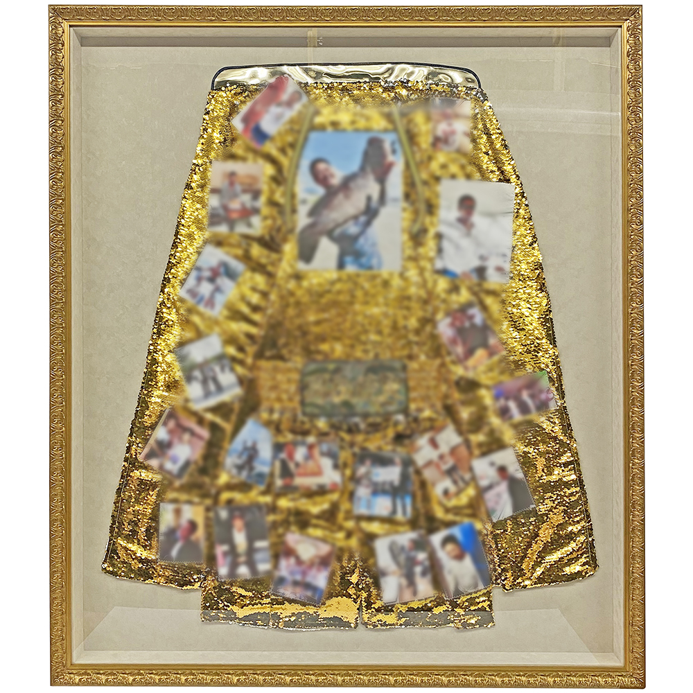 ボクシングのガウンとトランクス。金のスパンコールで作られたド派手な逸品です。布にプリントされたお写真が、いたるところに散りばめられています。