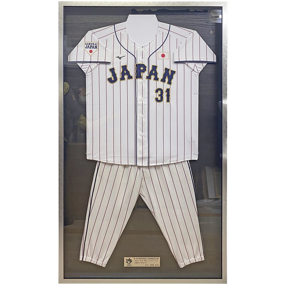 第5回 WBSC U-15 ワールドカップ、侍ジャパンの上下ユニフォームの額装です。鹿取監督と菅原コーチ、両名が使用したユニフォーム。ハーフパンツのため、上下を飾っても150cmほどの高さで納まりました。