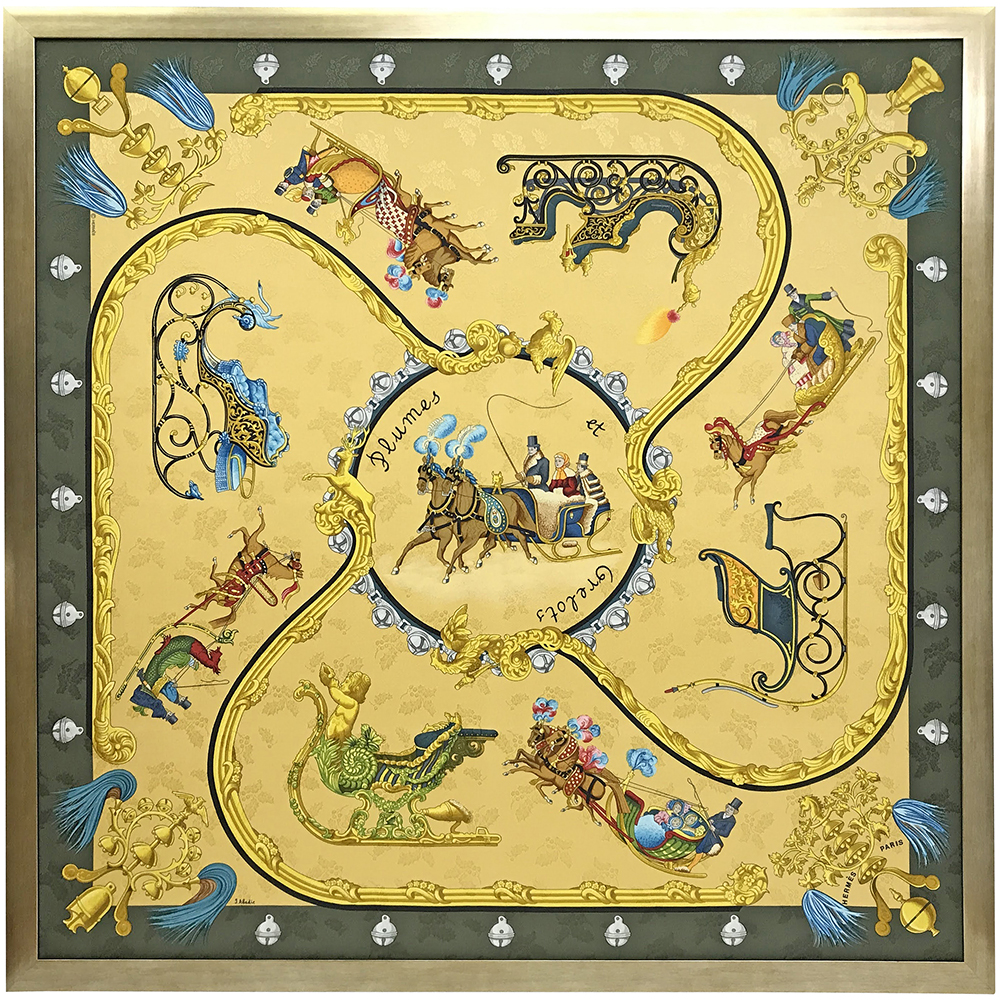 エルメスのカレ90「Plumes et Grelots(羽飾りと鈴)」を額装しました。金色の装飾や鈴、羽飾りが施され、華やかな印象のスカーフです。ホリデーシーズンの空気をまとったような、温かく上品な雰囲気です。